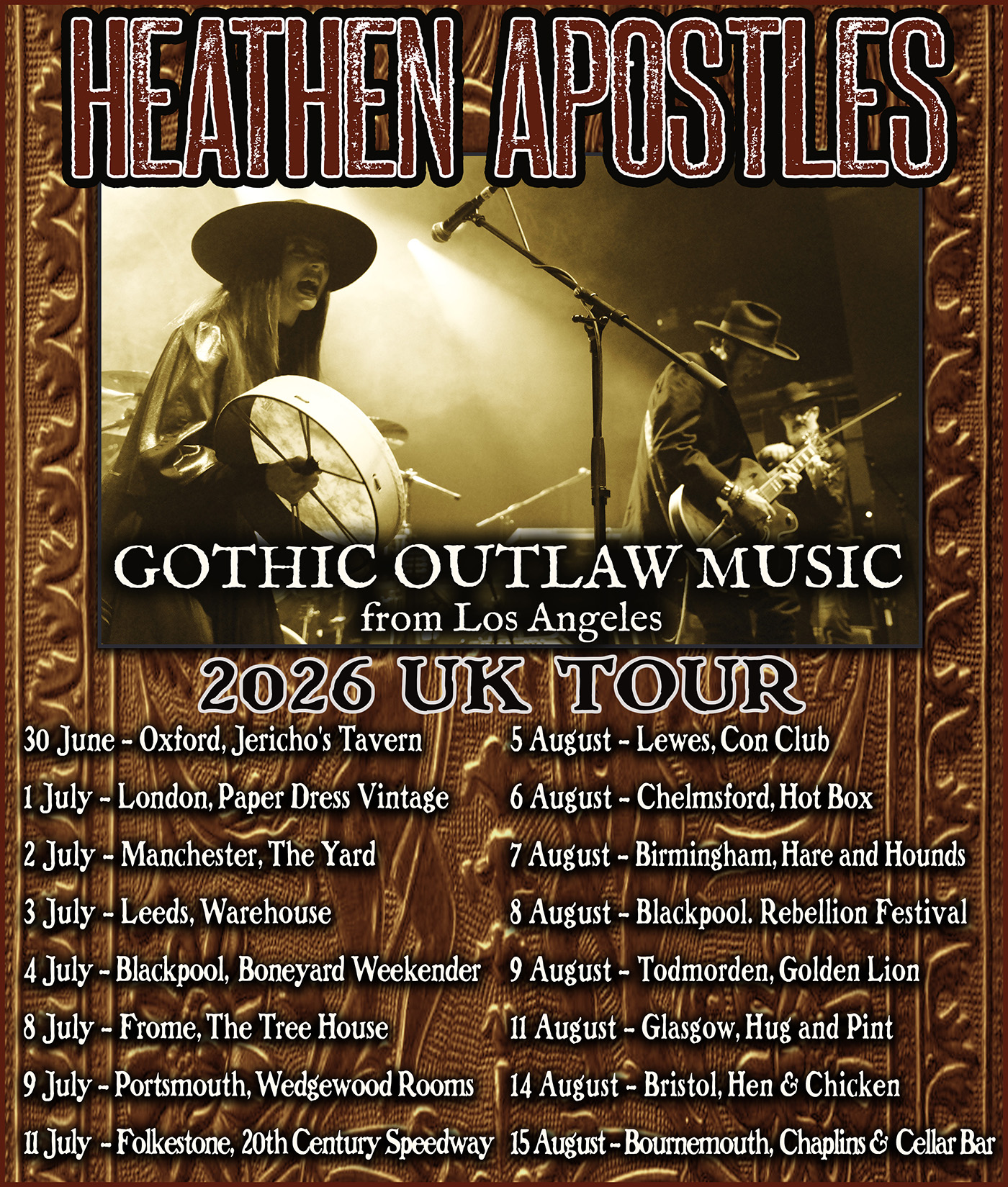Heathen Apostles Announce Alt Country UK Tour for Summer 2026 – The Heathen Apostles are psyched to reveal the first tour poster for their fifth visit to the UK, and they are very much looking forward to getting back over there. The Los Angeles-based Gothic Americana outfit will be hitting the road across two separate runs — June/July and again in August — making 2026 one of their biggest UK campaigns yet.